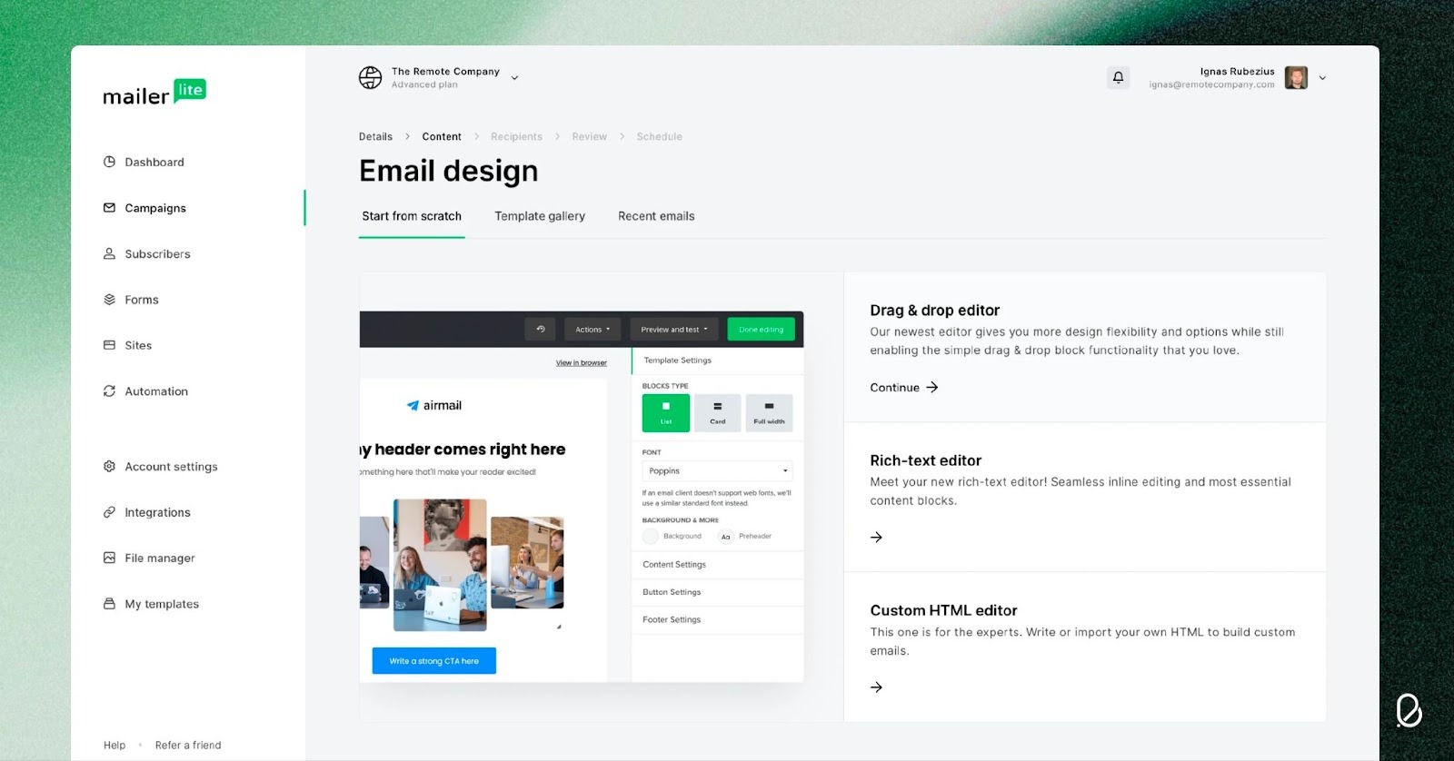 หากคุณกำลังมองหาเครื่องมืออีเมลที่ใช้งานง่าย ไม่ซับซ้อน แต่มีฟีเจอร์ครบครัน MailerLite คือคำตอบที่ตรงจุดที่สุด แพลตฟอร์มนี้ได้รับรางวัล 'Most Intuitive Interface' จากผู้ใช้งานหลายปีซ้อน ด้วย Drag-and-Drop Editor ที่ให้คุณออกแบบอีเมลสวยงามได้โดยไม่ต้องมีทักษะด้านการออกแบบ